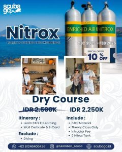 Get 10% off on all Scuba GO (Sanur & Tulamben) courses from OWC to AOWC, Deep Dive, Nitrox & Sidemount available exclusively from Desember 2025 to February 2026.